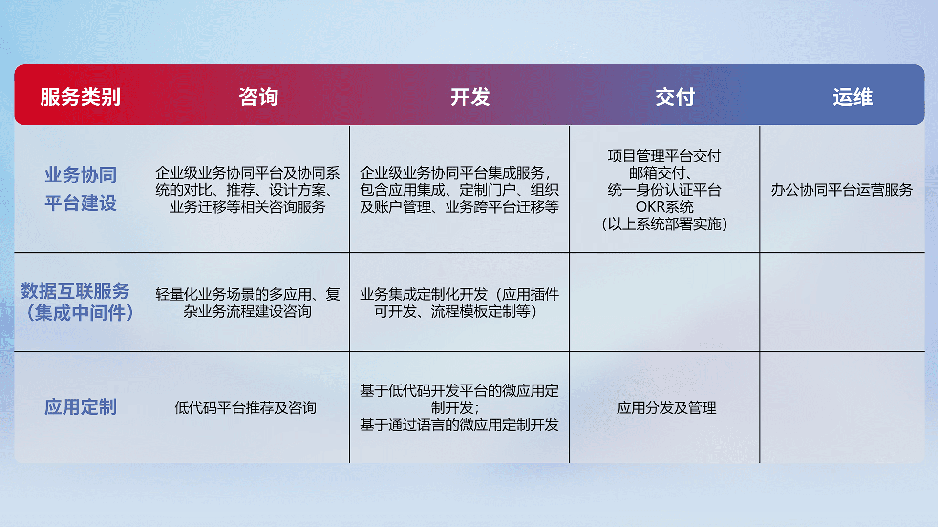 针对钉钉、、企微、、、IDaas等平台级产品提供产品的规划、、方案、、、交付、、定制化开发等服务,,,,实现如统一协同办公、、智能客户服务、、、混合会议管理、、智能数据查询、、、、等业务场景,,,实现数字化转型。。。